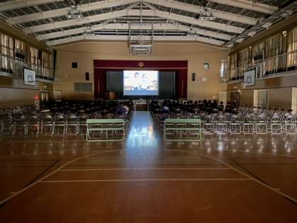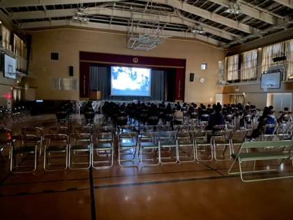 その後、6年間を体や健康に関する内容とともに振り返って、保健の高橋先生から話をしていただきました。最後に6年間で伸びた身長の長さのリボンをつけたカードを全員にプレゼントしていただきました。