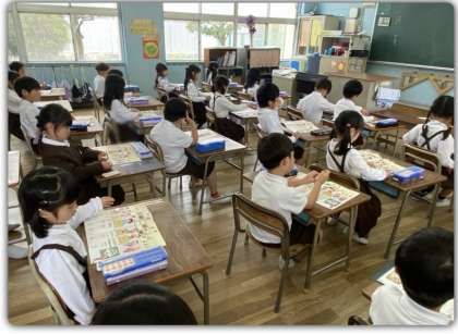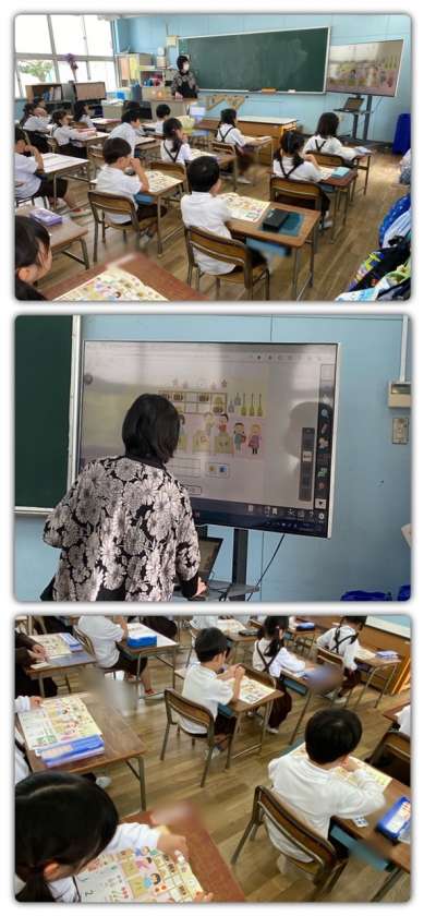 算数では、5までの数の数合わせの学習です。ブロックを使って、同じ数を探しました。