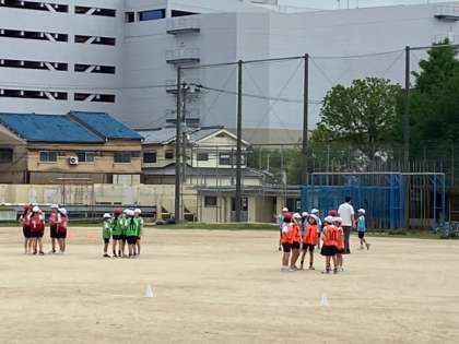 体育では、準備運動をした後、リレーのチームに分かれて、作戦を立てて、ゲームに挑みました。