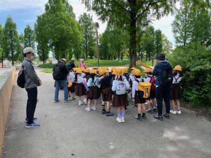 公園まで来ました。休憩しながら水分補給中です。交通ルールを守って、安全に来ることができました。