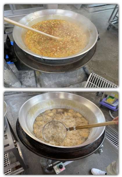 大きな鍋で全員分の給食を作っています。