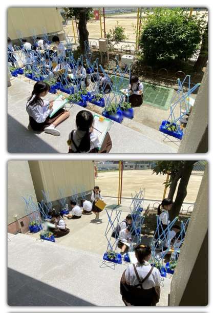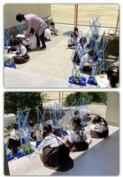 朝顔がだんだん大きくなってきています。今日は、朝顔の観察をしました。