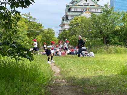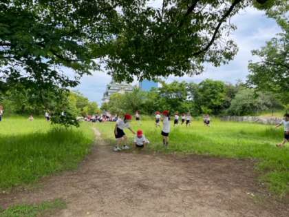 天守閣の近くで休憩中です。みんな元気いっぱいで楽しんでいます。
