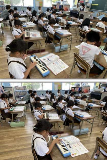 音楽では、鍵盤ハーモニカの音を鳴らすことを楽しみながら、歌を歌って、自由に演奏しました。