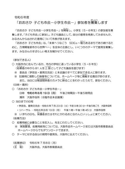 5、6年生対象 令和6年度「おおさか子ども市会ー小学生市会ー」の参加募集
