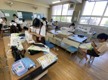 家庭科では、ミシンを使って、ナップサックを作っています。