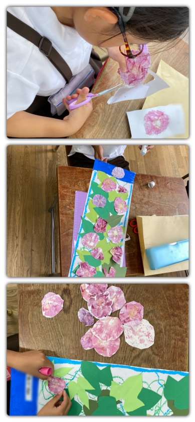 アサガオの鼻で色だしをして、作品を作りました。