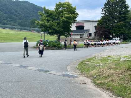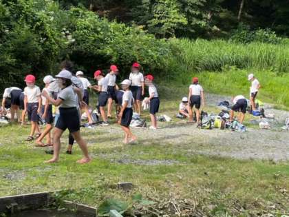 興奮のうちに魚つかみが終わり、宿舎に移動しています。これから、入浴、夕食、キャンプファイヤーと本日のメニューは、まだまだ続きます。子どもたちは、笑顔いっぱいで頑張っています。皆んな元気です。