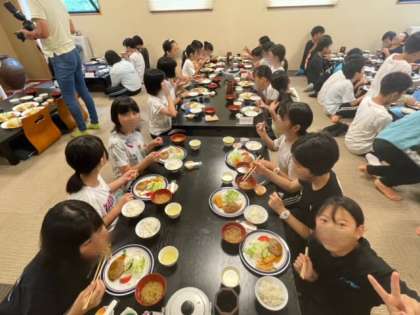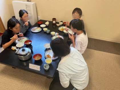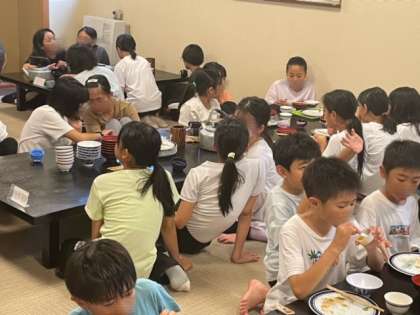 昼食のカレーライスもたっぷりあって、おかわりを沢山しましたが、夕食もほぼ完食でした。教員は、山登りで疲れ気味ですが、子どもたちは、パワー全開です。ご馳走様でした。これから勾玉作りです。