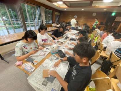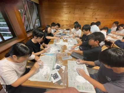 勾玉作りが始まりました。下絵を書いて、一生懸命削っています。完成品は、それぞれの個性溢れる作品に仕上がっています。