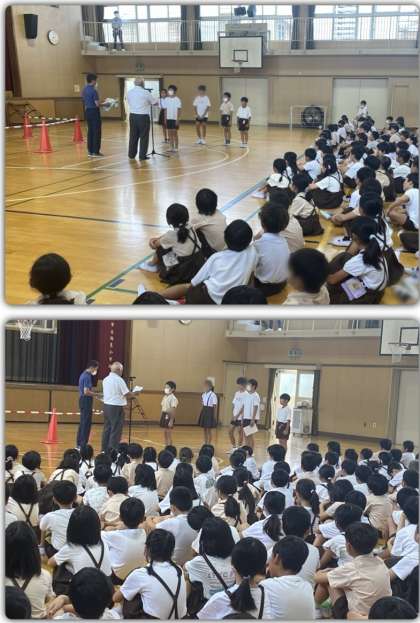 夏休みの水泳記録会に出た児童の表彰と紹介が行われました。