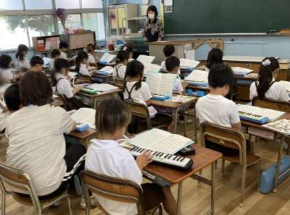 音楽では、鍵盤ハーモニカでいろいろな曲の練習をしました。同じ音を弾く時は、指を動かさずタンギングで鳴らすことを覚えました。