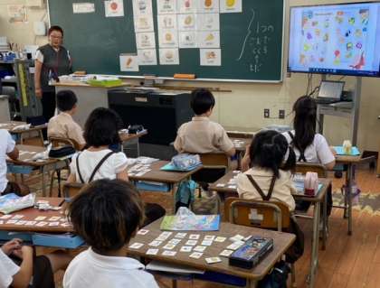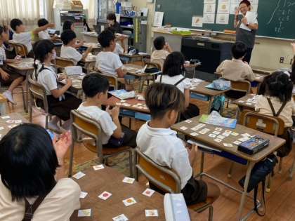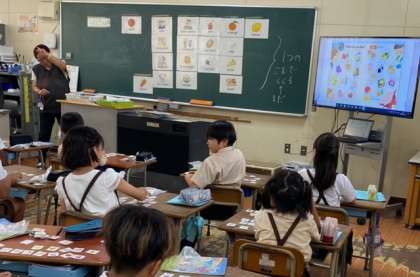 外国語活動では、絵カードの英語の説明をよく聞いて、どのカードが当てはまるかを見つけています。