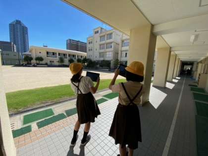 図画工作で、自分で描きたい校舎の景色を各自で探して、タブレット端末で撮影して、構図を考えました。