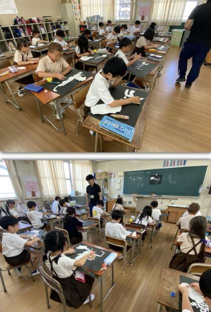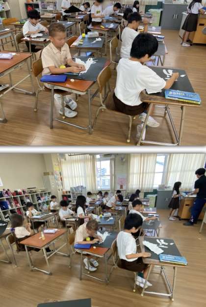 図画工作では、前回の学習の続きで、「ほねほねザウルス」の作品作りをしました。紙を細かくちぎって、丁寧に貼り付けていきました。