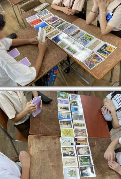 グループごとに、有名な絵画や作品の写真を並べて、ヒントをもとにどのカードの話をしているのか、考えました。