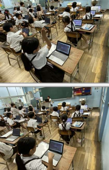 タブレット端末で、クイズをしながら学習したり、朝の短時間英語学習に取り組んだりしました。