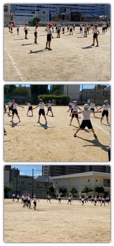 運動会で行うリズムダンスの練習をしました。運動場で踊るのは初めてでした。運動場の広さに合わせて、隣の人との感覚を覚えていきます。