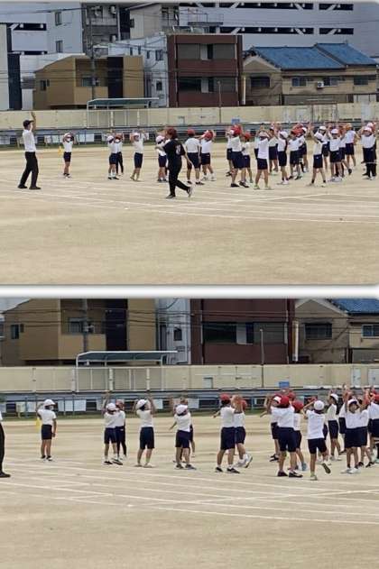 体育では、運動会の練習をしています。ラジオ体操で、準備運動をしてから、練習をしました。