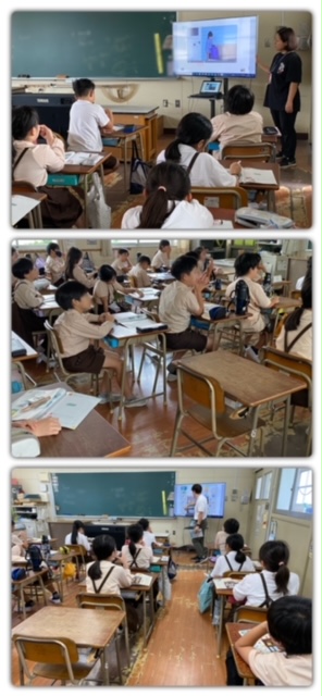 外国語活動では、C-NETの先生の発音をマネたり、文房具や外国の子どもの持ち物について、動画を見て英語で答えたりして、学習しました。