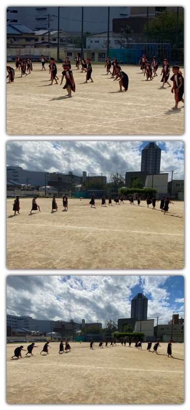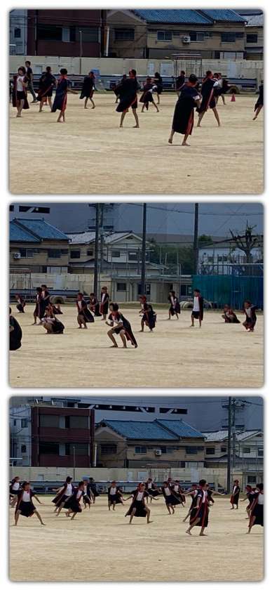 衣装を身につけて、団体演技のダンスの練習をしました。踊っている間に、はちまきがずれ下がってきたり、外れたりしている児童が何人かいましたが、それぞれで踊りながら直したり、手に持ったりして踊っていました。