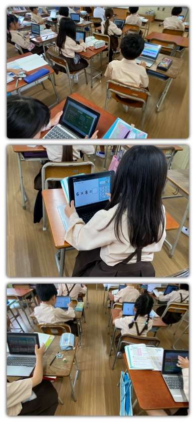 タブレット端末を使って、かけ算九九の復習を自分のできるレベル(かける数が1からの順、逆からの順、バラバラ)を選んで進めていきました。