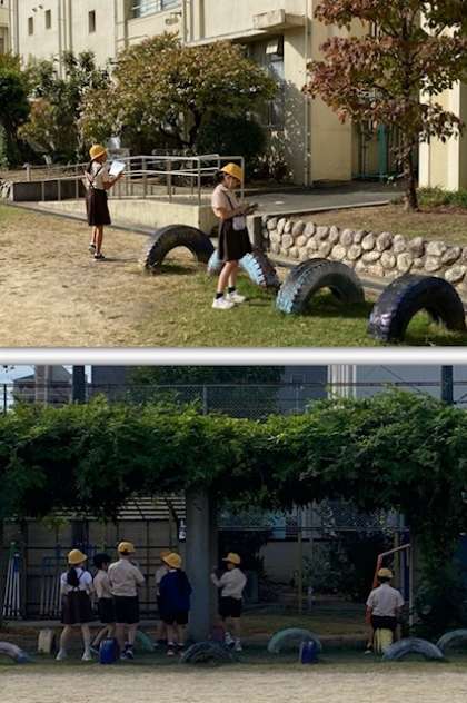 秋を探しました。植物や生き物の秋を見つけて、タブレット端末で写真を撮りました。