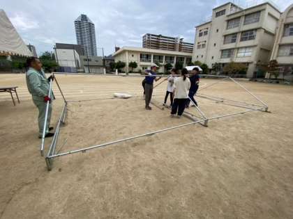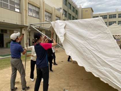 放課後、雨が少しぱらつきはじめましたが、教職員で、運動会で使うテントを前回に引き続きたてました。