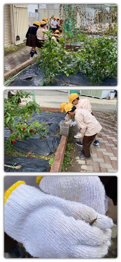 秋の自然の生き物探しをしました。学習園の草むらをかき分けて探し、バッタを見つけました。