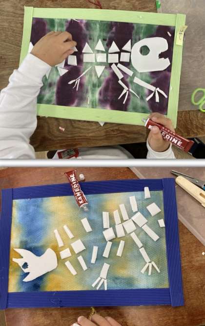 色付けをした紙の上に、スチレントレイ(食品トレイ)を切って組み合わせて、恐竜を作りました。