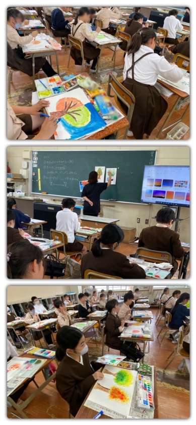 図画工作では、自然の木の様子をクレパスと絵の具を使って描きました。