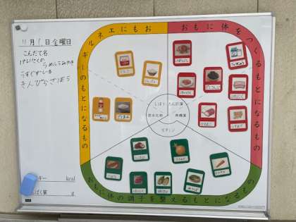 栄養素の赤黄緑の部分にそれぞれバランスよく入っています。いっぱい食べてください。いただきます。