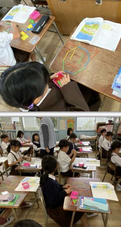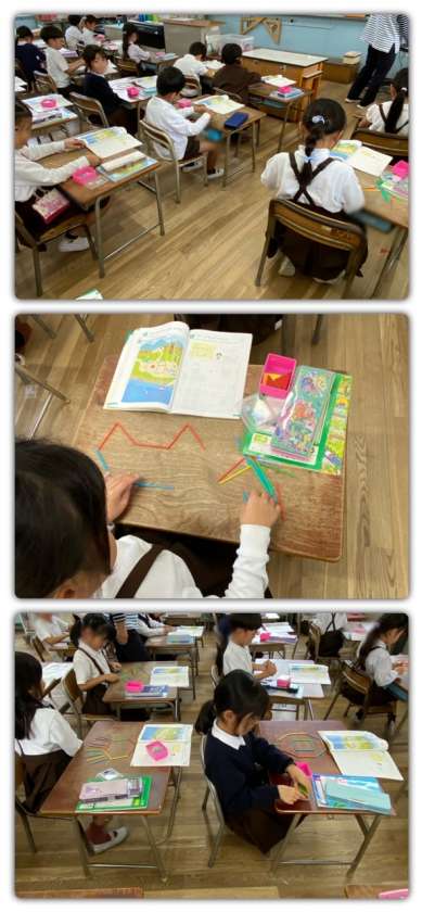 算数の教科書の絵の通りの形づくりをしました。それができたら、それぞれが考えた形づくりを棒を並べて行いました。