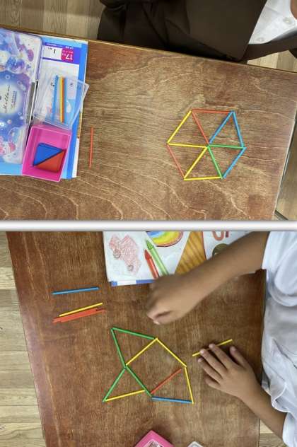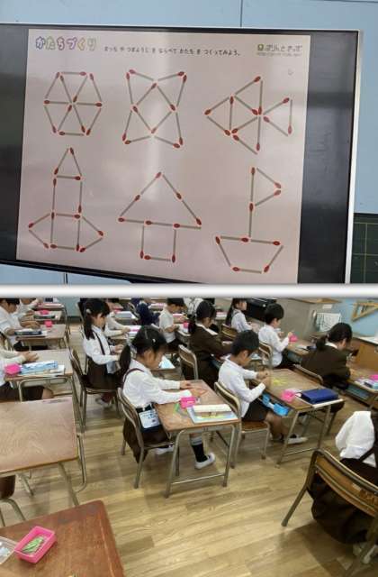 算数では、棒の数をよくみて、図と同じ形づくりをしています。