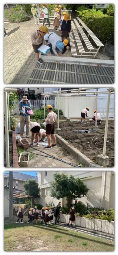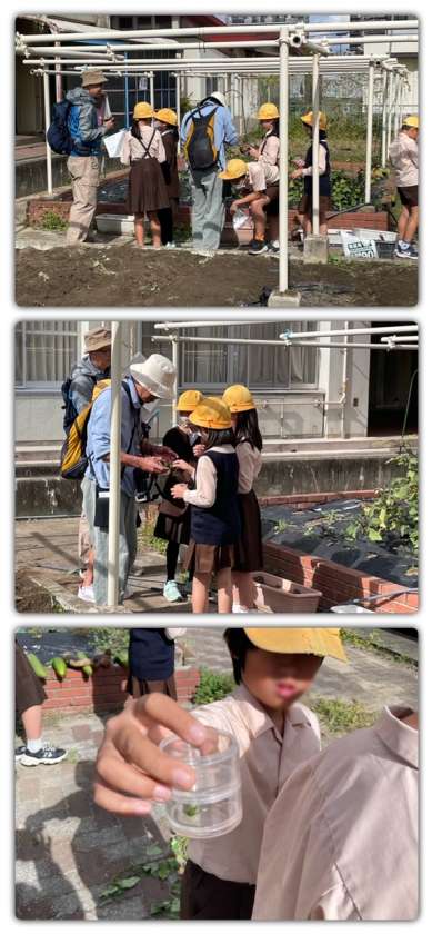 6月に引き続き、環境局の生き物専門の方々に来ていただいて、秋の自然の生き物探しをしました。校内の草花や虫などを探して、環境局の方に生き物の生態や名前など教えていただきました。