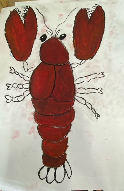 図画工作では、ザリガニの絵を書いています。今にも動き出しそうなザリガニになってきています。