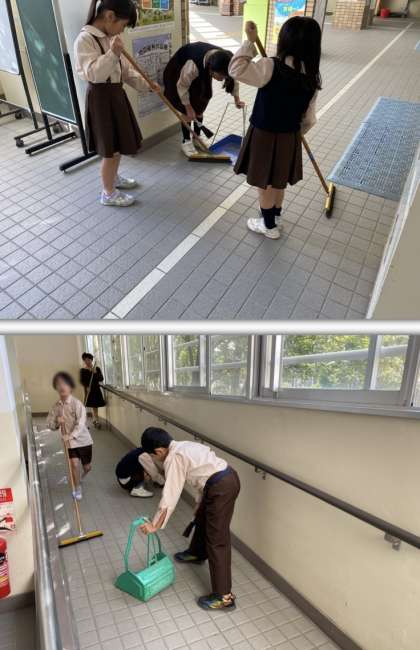 どの学年も、丁寧に掃除をしています。写真は、玄関付近を掃除している様子です。