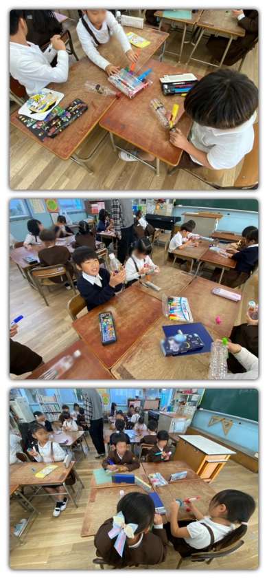 来週、出前授業で教えていただく生花をする時の花瓶作りをしました。花瓶は、ペットボトルに色付けや絵を描いて作りました。