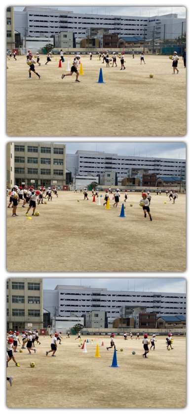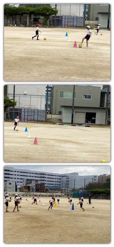 ボール蹴りゲームに向けて、ボールをドリブルで蹴ったり、遠くへ蹴ったり、的をめがけて蹴ったりしました。