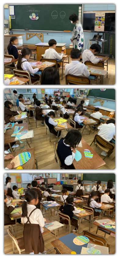 手袋と冬用の帽子の模様を考えて、クレパスで描き、帽子と手袋を身につけた人を描きました。