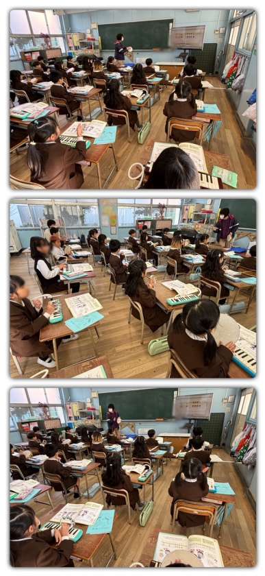 曲に合わせて、タンブリン、鈴、鍵盤ハーモニカの楽器に分かれて、演奏しました。