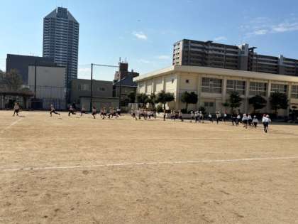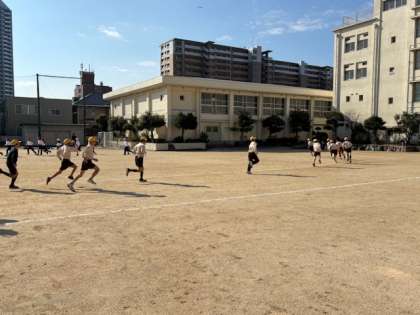 今日の15分の休み時間は、2・5年生がかけ足で運動場を走りました。