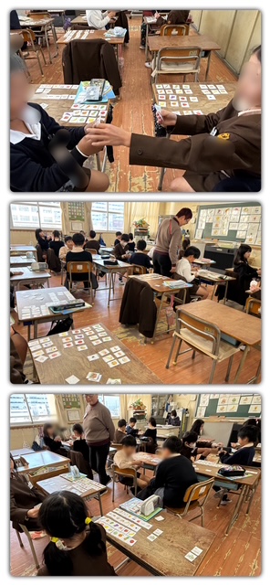 外国語活動の学習では、動物などの絵カードをトランプのように取り合って、カードが揃ったらカードの名前を英語で言いあいました。
