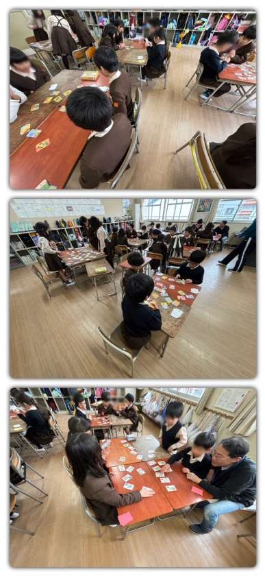 いろはカルタをしました。グループごとに読る人と取る人に分かれて、ゲームを進めました。