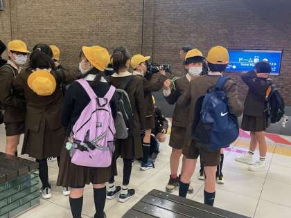 朝7時過ぎに出発し、先ほどキッザニア甲子園に到着しました。沢山の学校が来ています。