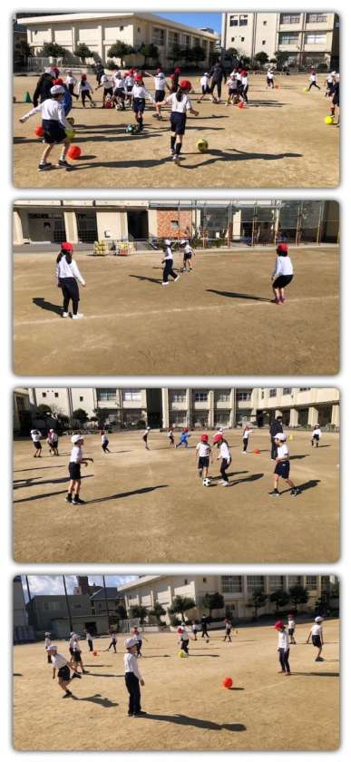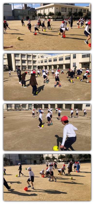 低学年なので、ボールの蹴り方、扱い方を教えたいただいた後、ボール蹴りゲームにチャレンジしました。言われた言葉の文字数の人数がコートに出て、ボールを決められたところへ送るゲームです。どんどんと順番が回ってくるので、たくさん走り続けて楽しんでいました。