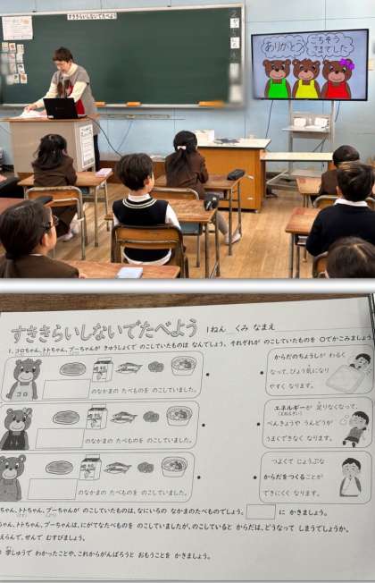 栄養教諭の方に来ていただいて、「好き嫌いをしないで食べよう」をメテーマとして、学習しました。