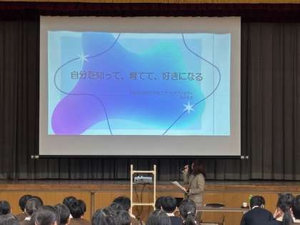 本校のスクールカウンセラーの先生に、今日は講師として、「自分を知って、育てて、好きになる」をテーマに話をしていただきました。