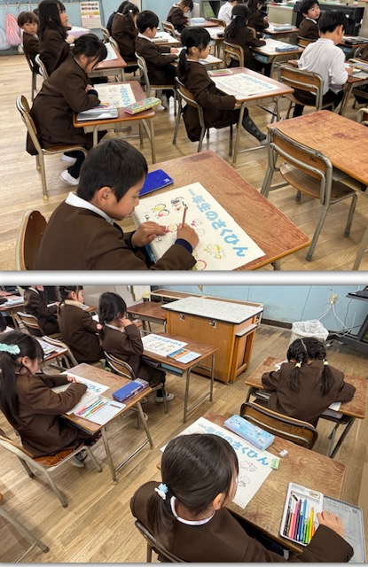1年を振り返り、図画工作で描いた作品をまとめる表紙の色塗りをしました。