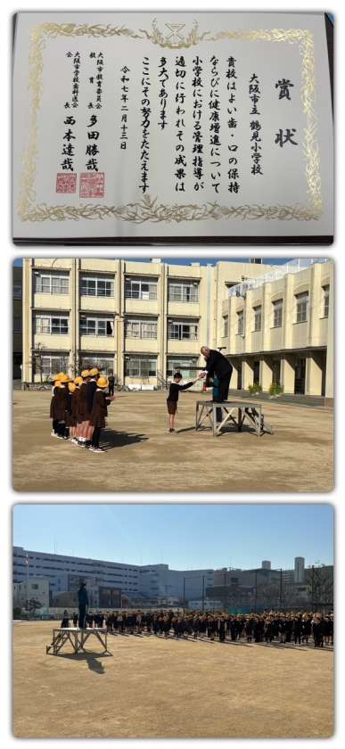 教育長表彰された児童の紹介と、鶴見小学校の児童が良い歯、口の保持増進ができていますと言う、学校のみんなへの表情の紹介、ソフトボールの大会で成績を残した分の紹介をしました。